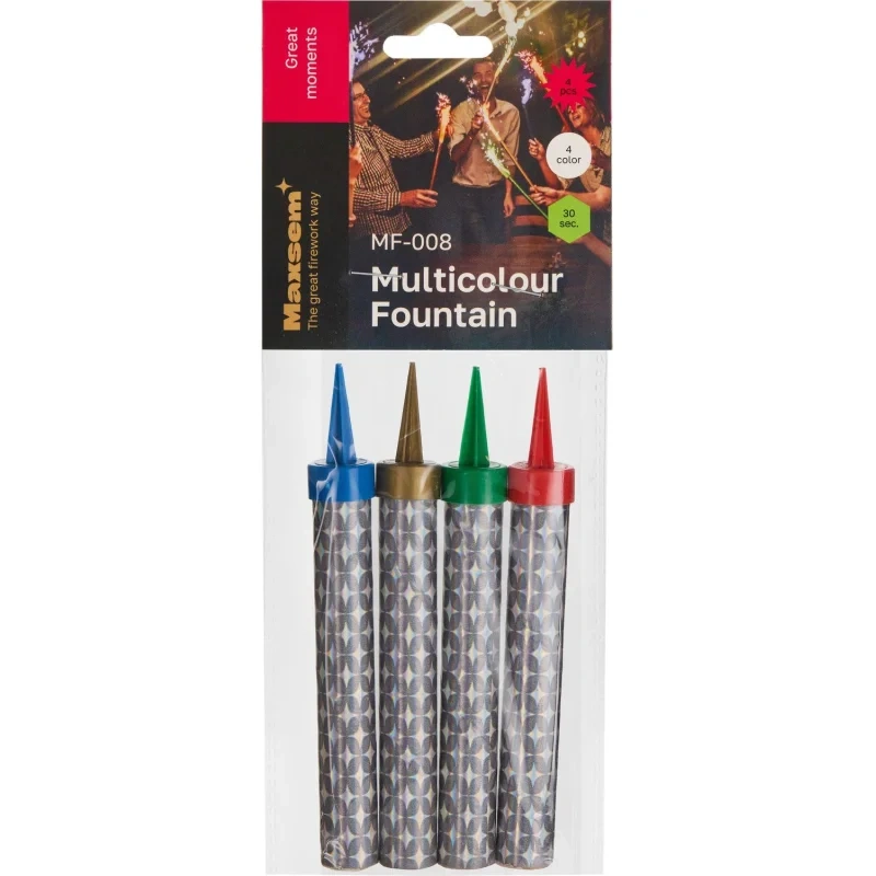 Набор свечей для торта Maxsem Разноцветный Фонтан 10 см (4 штуки в упаковке). Фейерверк для торта — это эффектный способ подать торт или любое угощение! Фейерверк в течение 50 секунд выбрасывает поток золотистых искр на высоту 0.5 метра. Можно использовать в помещении и держать в руках. Искры свечи имеют низкую температуру. Фейерверк для торта эффектно украсит праздничный торт, коктейли и другие блюда. Фейерверк также называют холодным фонтаном. Свое название он получил за то, что сгорает при более низкой температуре, если сравнивать с обычным фейерверком, в котором достигается температура до нескольких тысяч градусов. Именно благодаря этому данный фейерверк и считается безопасным. Фейерверк для торта имеет увеличенную длину, создает мощный и «пушистый» поток холодных искр, безопасных для использования в помещении. Фонтан для торта не создает дыма, с него ничего не «сыпется». Для корректной работы фонтан должен быть расположен строго вертикально. В упаковке 4 свечи по 10 см.