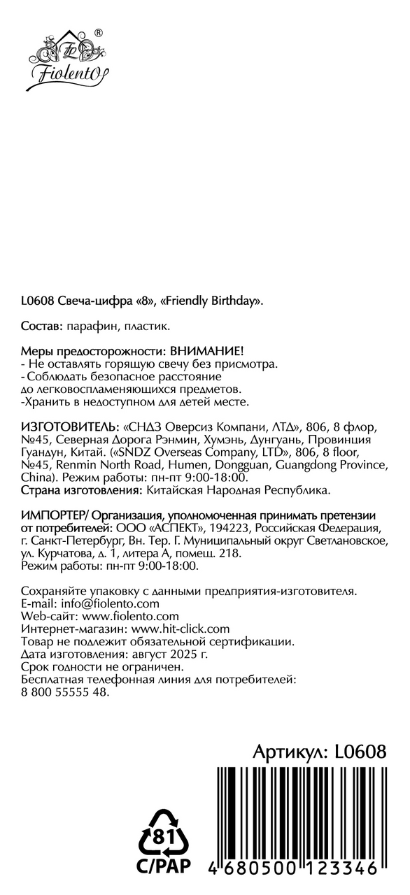 Свеча-цифра 8 Fiolento Friendly Birthday