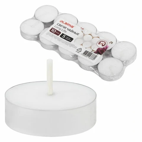 Свечи чайные Long Life, до 5 часов горения, вес 12 г, КОМПЛЕКТ 10 шт., в гильзе, LAIMA, 609199
