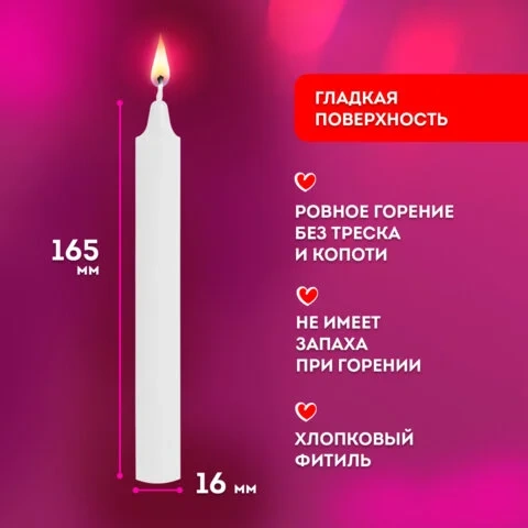 Свечи изготовлены из качественного парафина с добавлением пальмового масла, что обеспечивает яркое, устойчивое горение без копоти и неприятного запаха. Хлопковый фитиль гарантирует равномерное горение, без потрескивания и разбрызгивания.