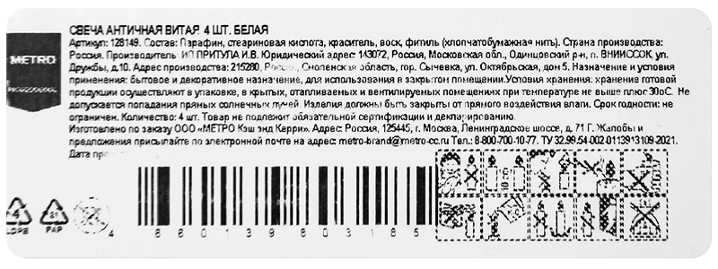 Свеча Metro Professional Античная белая витая, 4шт/уп