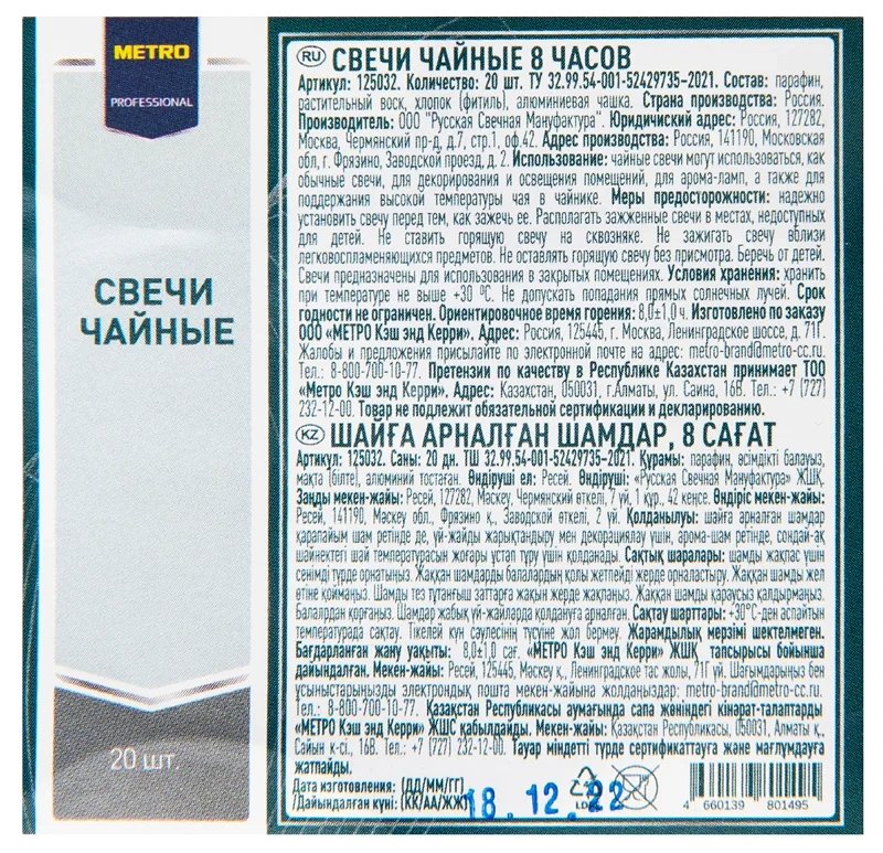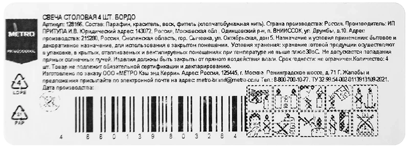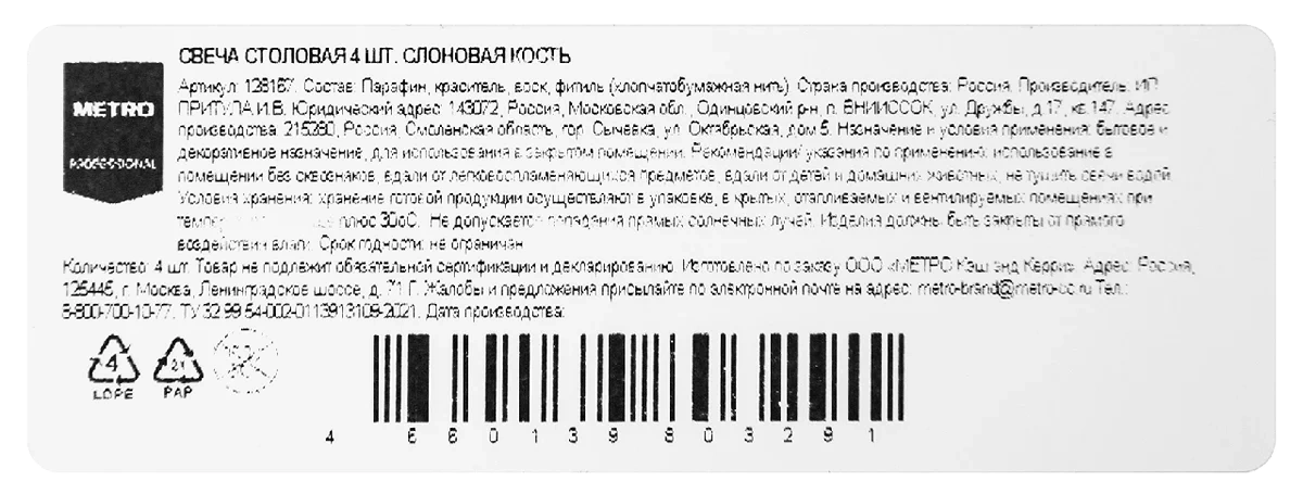 Свеча Metro Professional столовая слоновая кость, 4шт/уп