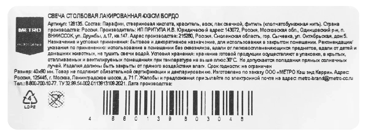 Свеча Metro Professional Античная бордо, 4шт/уп