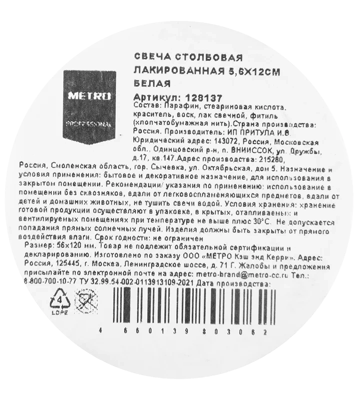 Свеча Metro Professional лакированная белая, 5.6х12см