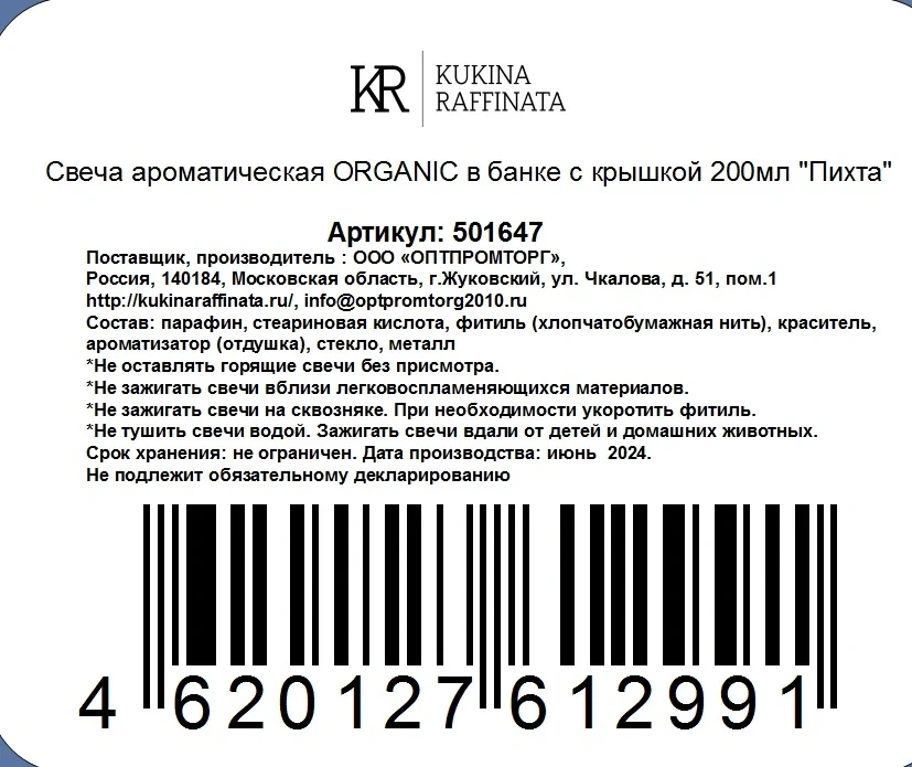 Свеча ароматическая Kukina Raffinata Organic в банке с крышкой Пихта, 200мл
