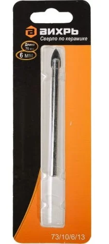 Предназначено для сверления отверстий в стекле, мраморе, керамической и кафельной плитке. Изготовлено из конструкционной легированной стали 45Х. Твердосплавная пластина изготовлена из сплава ВК6. Имеет цилиндрический хвостовик.