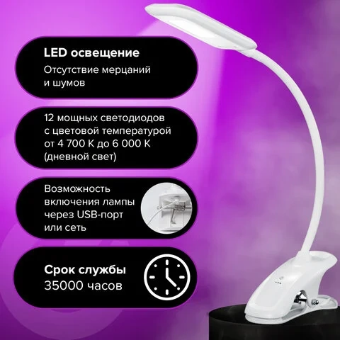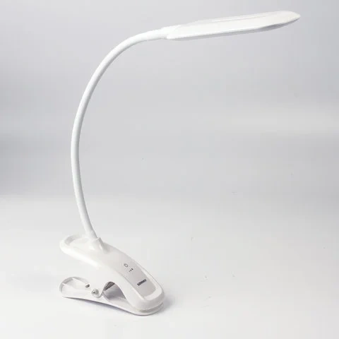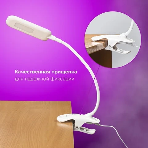 Настольный светильник высотой 31,5 см представлен в классическом белом дизайне, благодаря которому гармонично впишется в офисный или домашний интерьер. Устройство оснащено легким пластиковым корпусом на прищепке и яркой LED- матрицей на 8 Вт. Вы будете довольны освещением с цветовой температурой от 4700 до 6000 K и световым потоком 350 Лм, которое обеспечивают 12 светодиодов. Прибор оснащен сенсорным выключателем. Благодаря 3 режимам свечения можно самостоятельно выбрать яркость света.