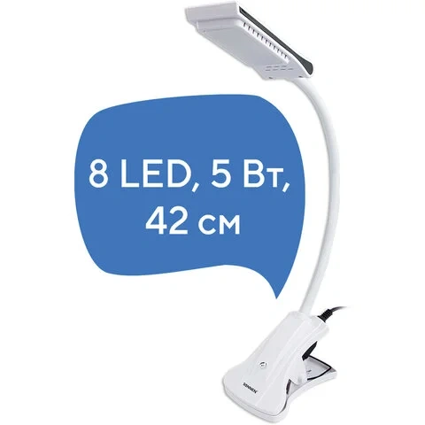 Настольный светильник высотой 42 см представлен в классическом белом дизайне, благодаря которому гармонично впишется в офисный или домашний интерьер. Устройство оснащено легким пластиковым корпусом на прищепке и яркой LED-матрицей на 5 Вт. Вы будете довольны освещением с цветовой температурой более 6100 K и световым потоком 220 Лм, которое обеспечивают 8 светодиодов.