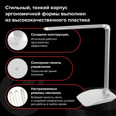 Настольный светильник высотой 38,7 см представлен в классическом сером дизайне, благодаря которому гармонично впишется в офисный или домашний интерьер. Устройство оснащено легким пластиковым корпусом и яркой LED-матрицей на 9 Вт. Вы будете довольны освещением с цветовой температурой от 3500 до 4500 K и световым потоком 500 Лм, которое обеспечивают 30 светодиодов. Прибор оснащен сенсорным выключателем. Благодаря 3 режимам свечения можно самостоятельно выбрать яркость света.