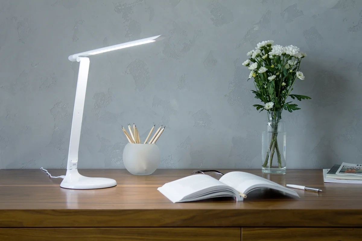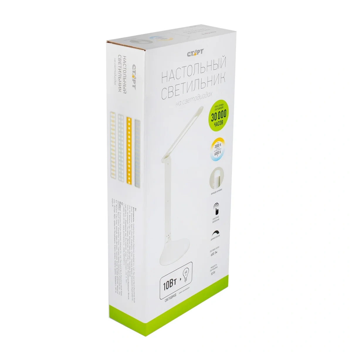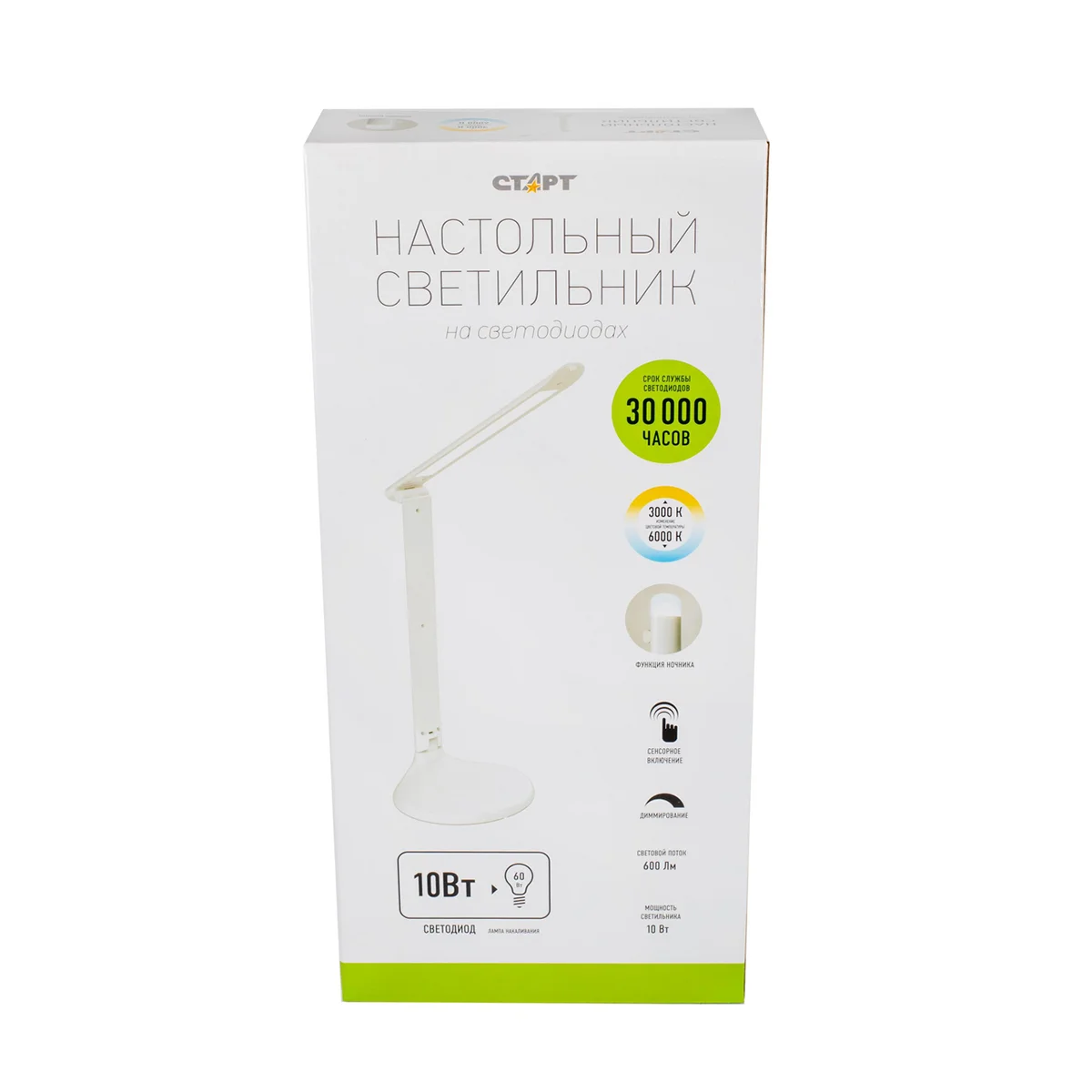 Старт СТ59 — функциональная настольная лампа, является эффективным решением освещения рабочего пространства. Светильник, выполненный в лаконичном современном стиле, производится в двух цветах: черном и белом. Электроприбор станет прекрасным дополнением в домашних интерьерах или офисных помещениях. Светильник оборудован сенсорной панелью для включения, расположенной на его основании. Регулируемый угол наклона позволяет комфортно освещать рабочую поверхность. Благодаря встроенному диммеру настольная лампа имеет три уровня яркости для выбора оптимального режима освещения: от теплого белого (3000К) до холодного белого (6000К). В сложенном состоянии светильник может выполнять функцию детского ночника.