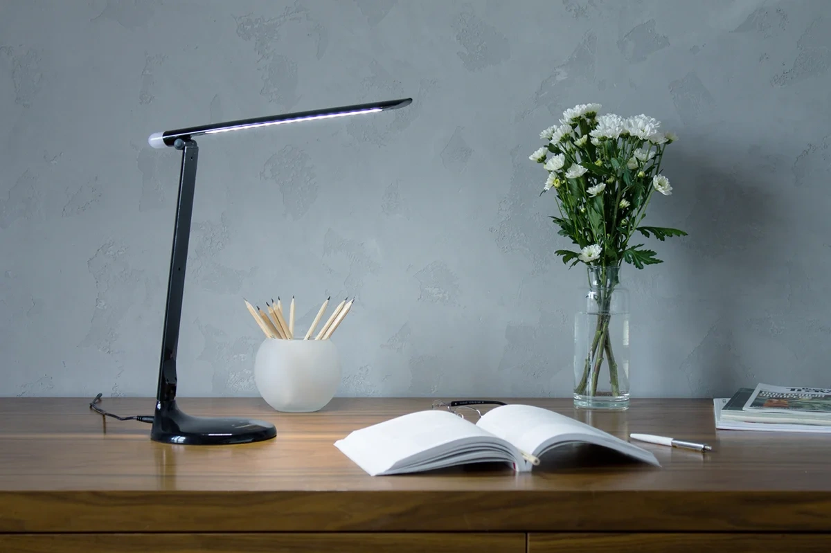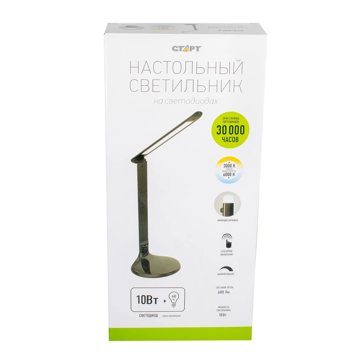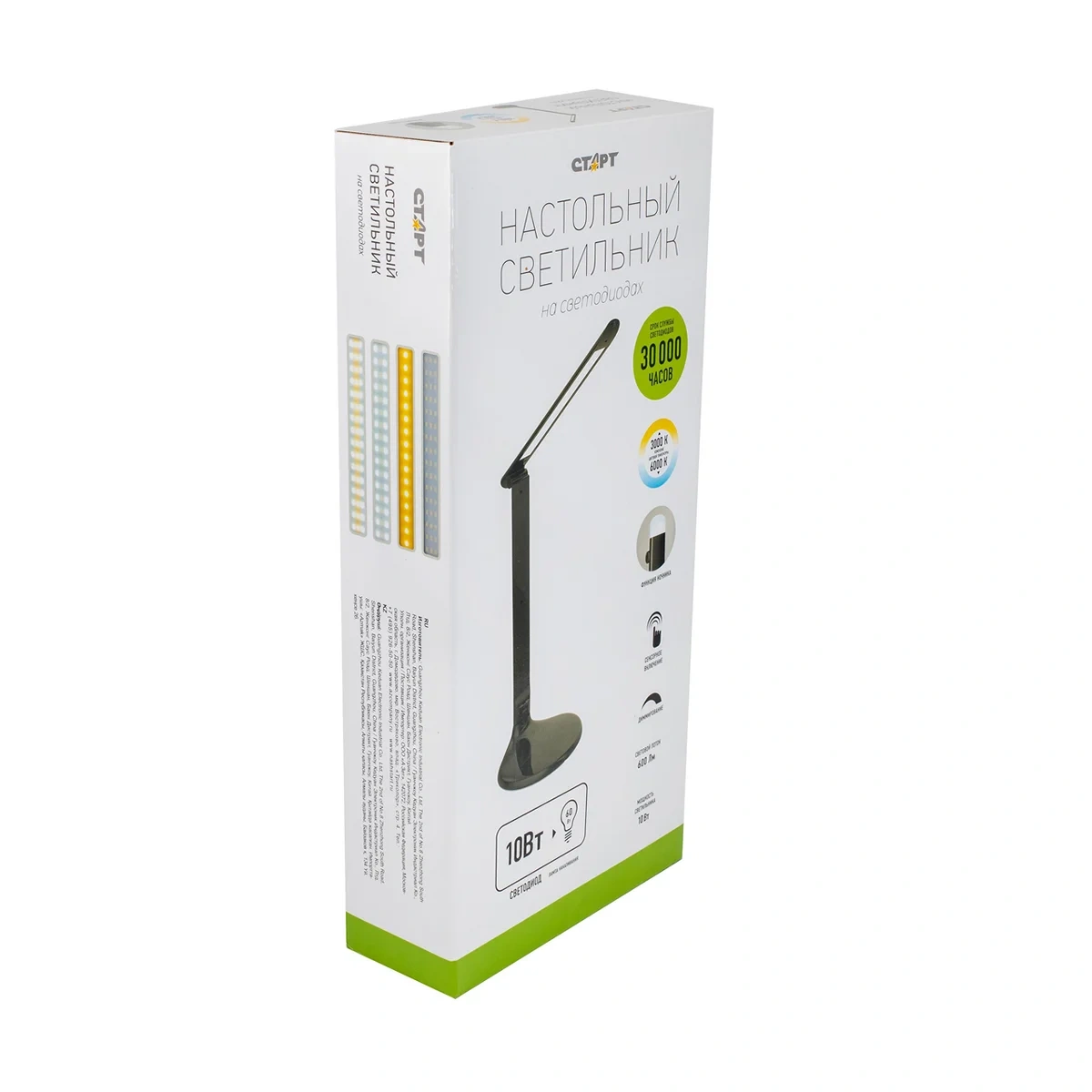 Старт СТ59 — функциональная настольная лампа, является эффективным решением освещения рабочего пространства. Светильник, выполненный в лаконичном современном стиле, производится в двух цветах: черном и белом. Электроприбор станет прекрасным дополнением в домашних интерьерах или офисных помещениях. Светильник оборудован сенсорной панелью для включения, расположенной на его основании. Регулируемый угол наклона позволяет комфортно освещать рабочую поверхность. Благодаря встроенному диммеру настольная лампа имеет три уровня яркости для выбора оптимального режима освещения: от теплого белого (3000К) до холодного белого (6000К). В сложенном состоянии светильник может выполнять функцию детского ночника.