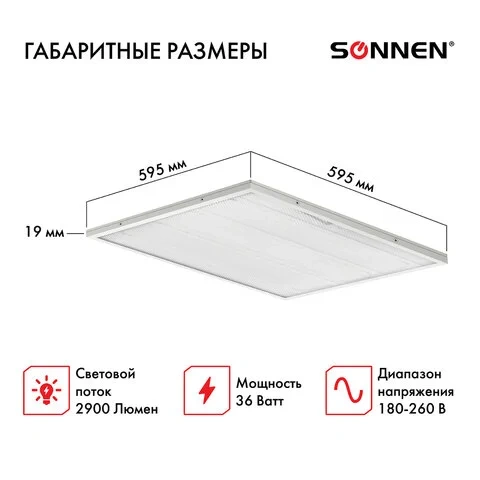 Прибор SONNEN освещает пространство со световым потоком, равным 2900 Лм, при цветовой температуре, составляющей 6500 К, благодаря чему подходит для обслуживания большого помещения. Его размеры составляют 595x19x595 мм.