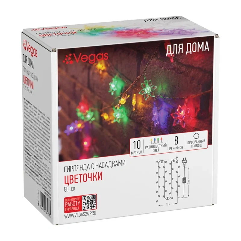 Электрогирлянда Vegas Цветочки 80 мульти, 8 реж. 10 м 55084
