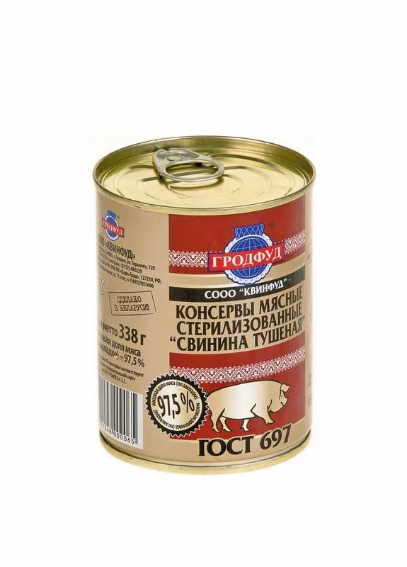 Свинина тушеная Гродфуд - это тушенка, которая полюбилась многим за счет значительного содержания мяса (97,5%) и пониженного содержания жира. Благодаря удобному кольцу банка легко открывается без применения консервного ножа. Еще с начала 19 века самым популярным видом мяса считается консервированная свинина, которая может храниться значительное время. Данный продукт создан специально для тех, кто ценит высокое качество и следит за своим здоровьем: тушенка изготовлена только из натуральных продуктов.