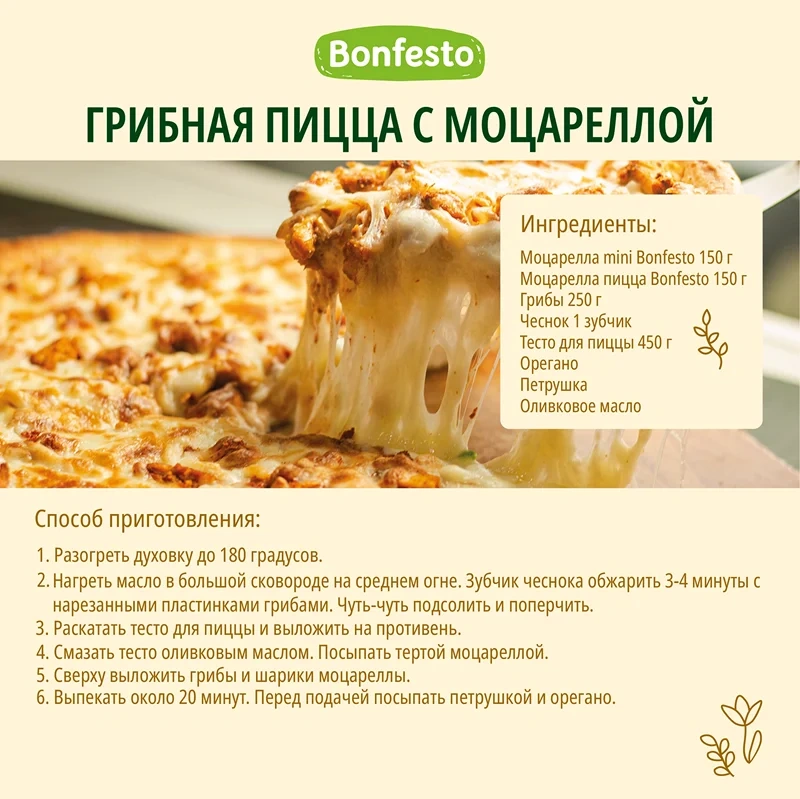Сыр Моцарелла Bonfesto для пиццы 45%, 250г – высококачественный продукт, изготовленный на основе молока. Особый сорт отличается плотной текстурой и пониженной влажностью. Благодаря этому продукт способен наилучшим образом раскрывать свои прекрасные вкусовые качества во время тепловой обработки. Сыр Моцарелла Bonfesto – идеально подходящий ингредиент для создания традиционных итальянских блюд, таких как пицца, лазанья, кальцоне. Продукт замечательно дополнит пироги и запеканки, а также может использоваться для приготовления различных бутербродов, салатов и холодных закусок.