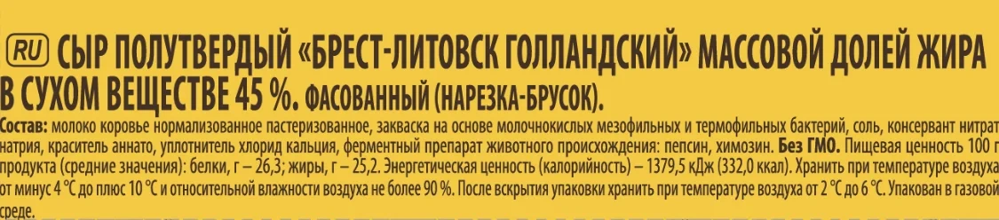 Сыр Брест-Литовск Голландский полутвердый 45%, 200г