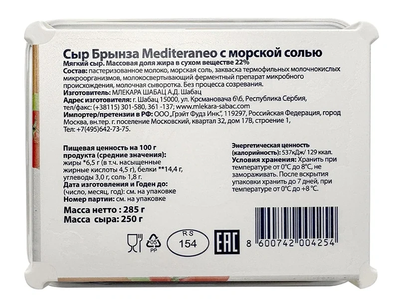 Сыр брынза Mlekara Sabac Mediterraneo 22%, 250г