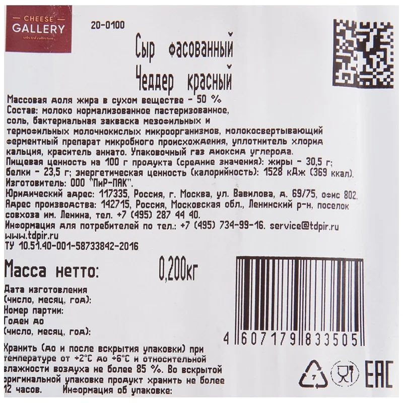 Сыр Cheese Gallery Чеддер красный полутвердый 50%, 200г