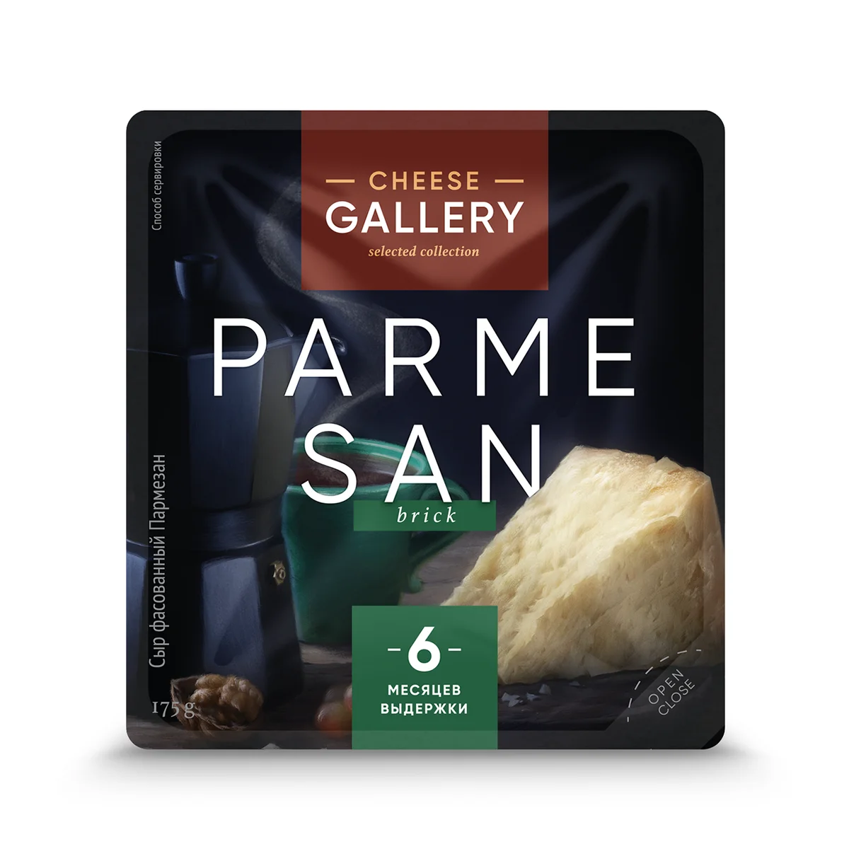 Пармезан, пожалуй, самый известный твердый сыр родом из Италии. Богатство и насыщенность вкусового профиля этого сорта определяется сроком его выдержки при созревании. Parmesan Cheese Gallery выдерживается в головах не менее полугода, прежде чем его режут на сегменты и отправляют на прилавок, поэтому он обладает выраженным фруктово-ореховым послевкусием и плотной ломкой текстурой. Такой сыр отлично подходит к блюдам и винам итальянской кухни.