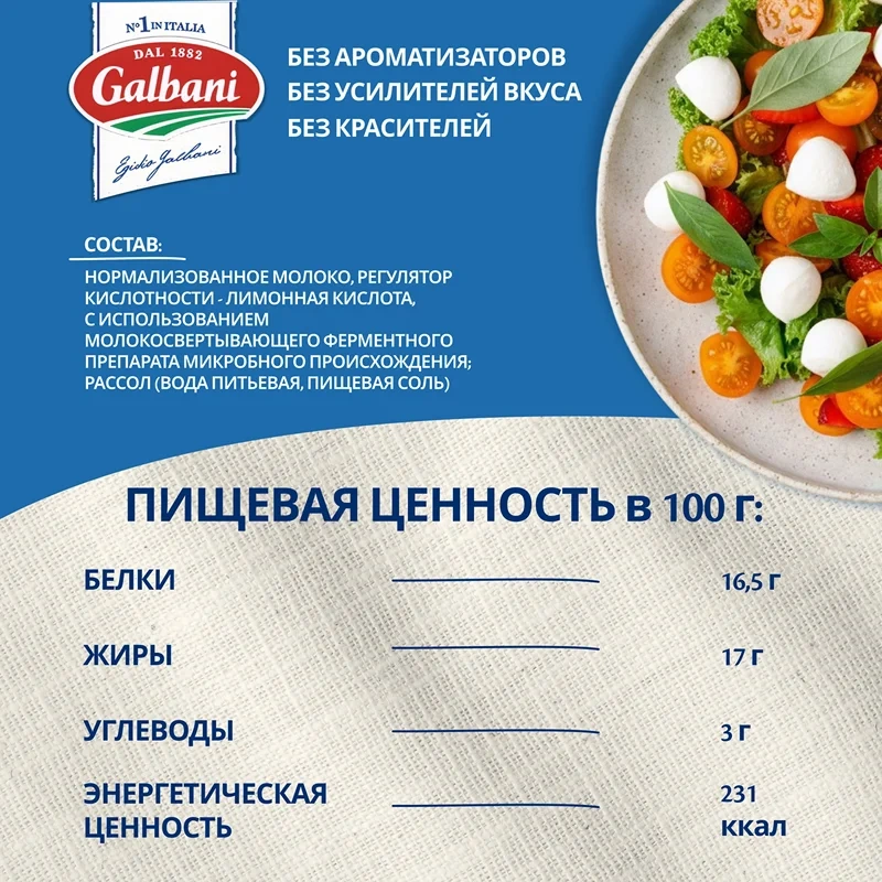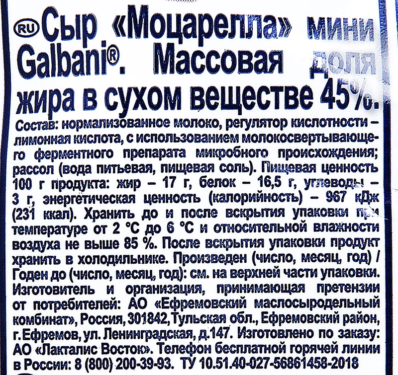 Молоко нормализованное пастеризованное, соль пищевая, молокосвертывающий ферментный препарат микробного происхождения, бактериальная закваска мезофильных молочнокислых микроорганизмов, краситель аннато (содержит регулятор кислотности гидроксид калия).