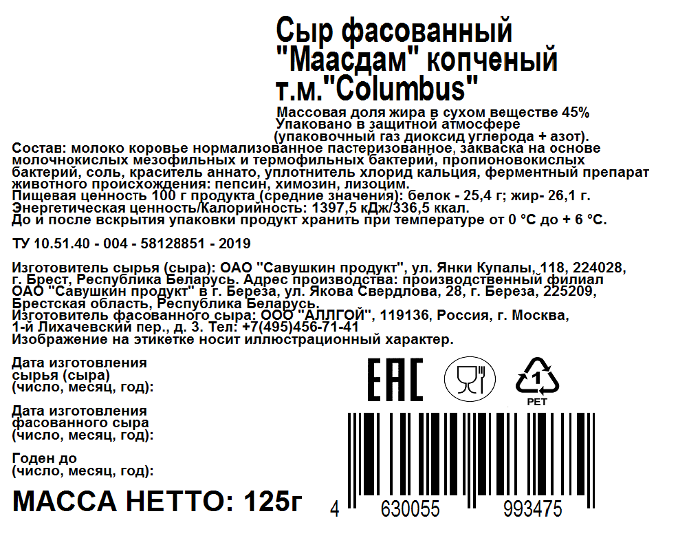 | Стандарт производства | ту 10.51.40-004-5812-8851-2019 |