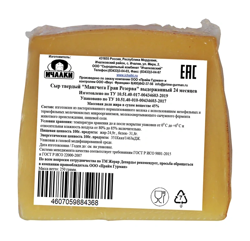 Сыр Manchego Gran Reserva, 250 г, 45%, БЗМЖ (без заменителя молочного жира)находится в вакуумной герметичной упаковке, позволяющей увеличить срок хранения. Продукт будет гармонично смотреться не только на повседневном, но и на праздничном столе. Производится по традиционной технологии, выделяется высоким качеством. Выделяется твердой структурой и тонким сливочным ароматом, в послевкусии ощущаются пряные нюансы. Применяется в кулинарии для приготовления тостов, добавления в салаты. Натертым сыром можно посыпать мясо или рыбу перед запеканием, чтобы получить аппетитную золотистую корочку.