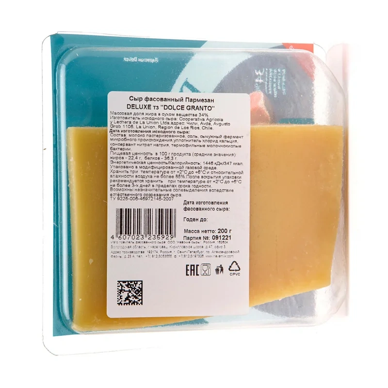 Сыр Dolce Deluxe Пармезан твердый 34%, 200г БЗМЖ. Сыр Dolce Deluxe Пармезан твердый 34%, 200г БЗМЖ является высочайшего качества сыром, который изготавливается из молока высокого процента масла. Этот сыр идеально подходит для любителей натуральных и вкусных продуктов.
