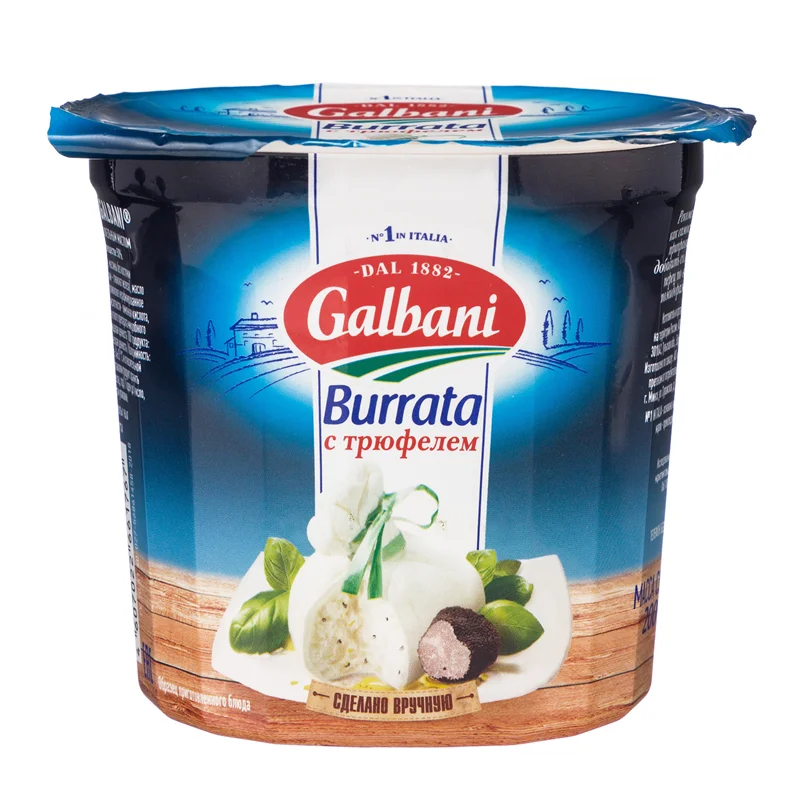 Сыр Galbani Burrata с трюфелем, 200 г мягкий, обладает нежной сливочной текстурой. Это продукт белого цвета с вкраплениями маслин и с добавлением трюфельного масла. У сыра легкий вкус, приятный аромат и длительное чуть сладковатое послевкусие. Продукт отлично сочетается с овощными салатами, особенно хорошо дополняет вкус помидоров. Сыр готов к употреблению, можно добавлять его в блюдо в исходном виде, а можно немного посолить, поперчить и сбрызнуть парой капель оливкового масла. Изделие поставляется в пластиковом стакане, который защищает его от посторонних запахов и солнечных лучей.