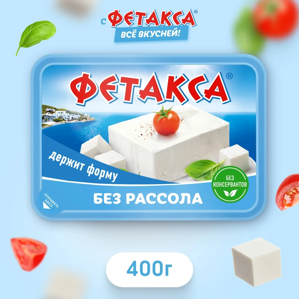 Сыр Фетакса – давно полюбившийся потребителям продукт с греческим настроением. Фетакса обладает неповторимым сливочным вкусом, который сделает ваше блюдо еще вкуснее и оригинальнее. Из традиционного рецепта сыра фета мы взяли все лучшее и воплотили это в две продуктовые линейки бренда Фетакса: В рассоле и Без рассола. Фетакса без рассола, 400 г, отличается плотной, упругой консистенцией, легко режется на кубики и ломтики любого размера и украсит ваше блюдо идеальными белоснежными кубиками. Прекрасно подходит для приготовления различных блюд: салатов - с куриной грудкой, грушами, свежими овощами, фаршировки овощей, которые подаются в сыром или запеченном виде и многих других. Своим деликатным вкусом и легким ароматом сыр Фетакса прекрасно дополняет легкие супы, сложные мясные и рыбные блюда, всевозможные запеканки. Также можно просто вкусно перекусить этим пикантным белым сыром с кофе или чаем. Фетакса производится без использования консервантов и растительных жиров, а еще все продукты Фетакса выпускаются в практичной упаковке, которая позволяет удобно хранить и использовать продукт. С Фетакса все вкусней!