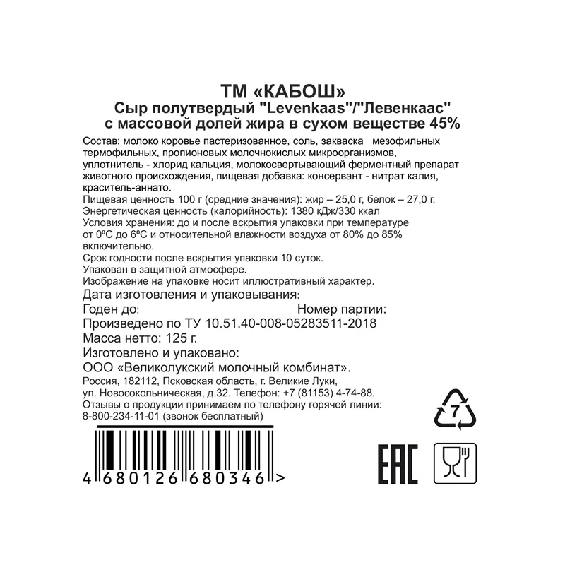 Сыр Кабош Levenkaas полутвердый нарезка 45%, 125г