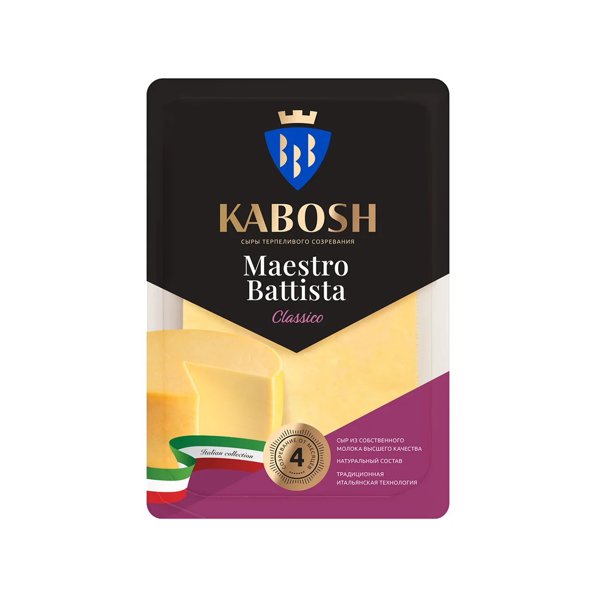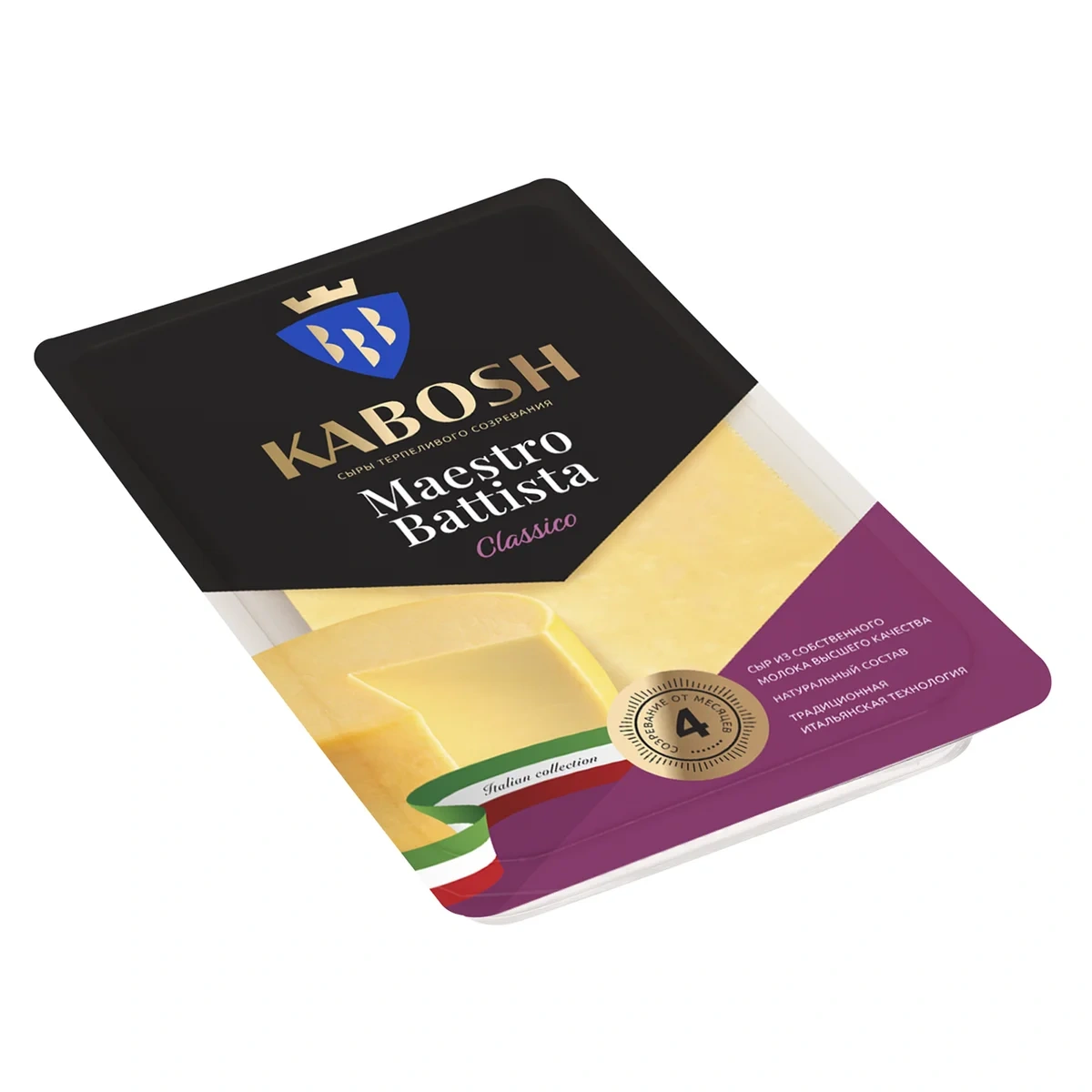 Сыр средней выдержки с выразительным пряным вкусом и не твердой, но плотной текстурой. Он обладает пикантным букетом с нотами трав и пряностей. Создатель, итальянский сыровар Баттиста Атторни, вдохновлялся превосходным сортом Piave. Имеет очень плотную текстуру без глазков. Обладает восхитительным вкусом. Этот сыр в течение 5 месяцев вызревает в особой камере, по микроклимату напоминающей пещеру. Периодически каждую голову чистят вручную специальными щетками и переворачивают. Российский бренд Кабош производит высококачественную продукцию, используя самое современное оборудование и первоклассное сырье. Длительное созревание всех сыров этой марки – важная особенность, позволяющая превратить молочные продукты в гастрономические шедевры.