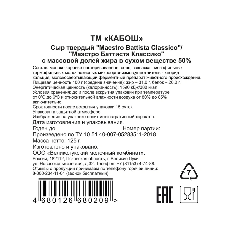 Сыр Кабош Maestro Batista Classico твердый нарезка 50%, 125г