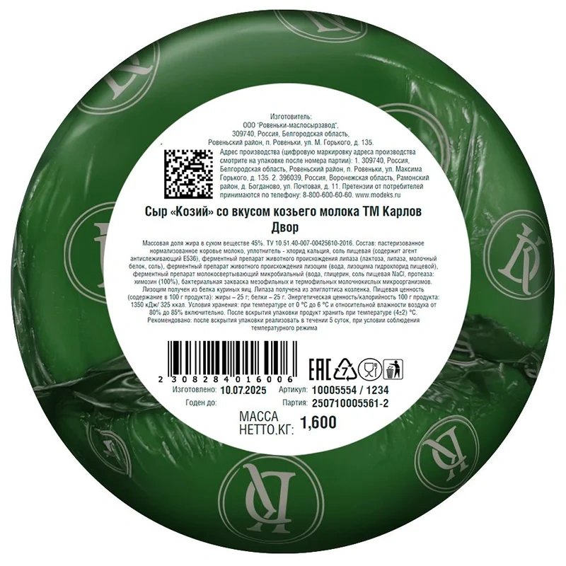 Сыр Карлов двор со вкусом козьего молока полутвердый 45%, ~1.6кг