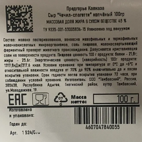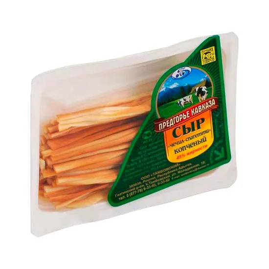 Сыр копченый Предгорье Кавказа Чечил спагетти, 100 г – удивительное сочетание пикантного вкуса и аромата, которые по достоинству оценят даже самые требовательные гурманы. Для производтства продукта используется натуральное молоко с использованием бактериальной закваски. Не содержит ГМО и красителей. Сыр прекрасно подходит для использования в кулинарии и приготовления легких закусок. Благодаря удобной упаковке его можно без труда взять с собой на пикник. Продукт содержит большое количество кальция и микроэлементов.