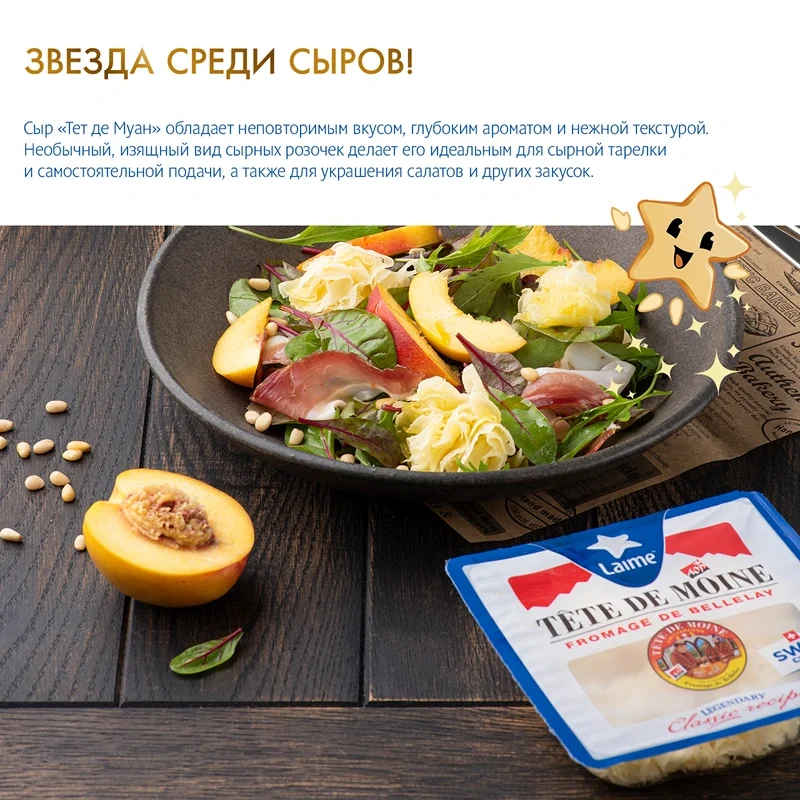 Изготавливается из свежего молока и отличается невероятно нежной текстурой, буквально тающей во рту. Головы сыра выдерживаются на полках из еловых досок не менее двух с половиной месяцев. С головы сыра полагается снимать тончайшую стружку при помощи ножа Жироль, благодаря чему получаются идеальные сырные розочки, которые отлично подойдут для украшения праздничного стола. Тет де Муан представляет собой полутвердый сыр плотной однородной конситенции с крепкой корочкой. Он изготавливается из свежего коровьего молока. В переводе с французского языка его название означает голова монаха.
