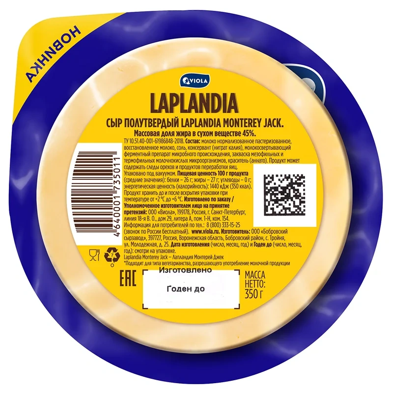 Сыр Laplandia Monterey Jack полутвердый безлактозный 45%, 350г