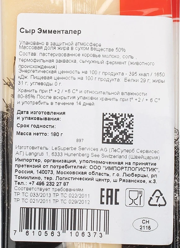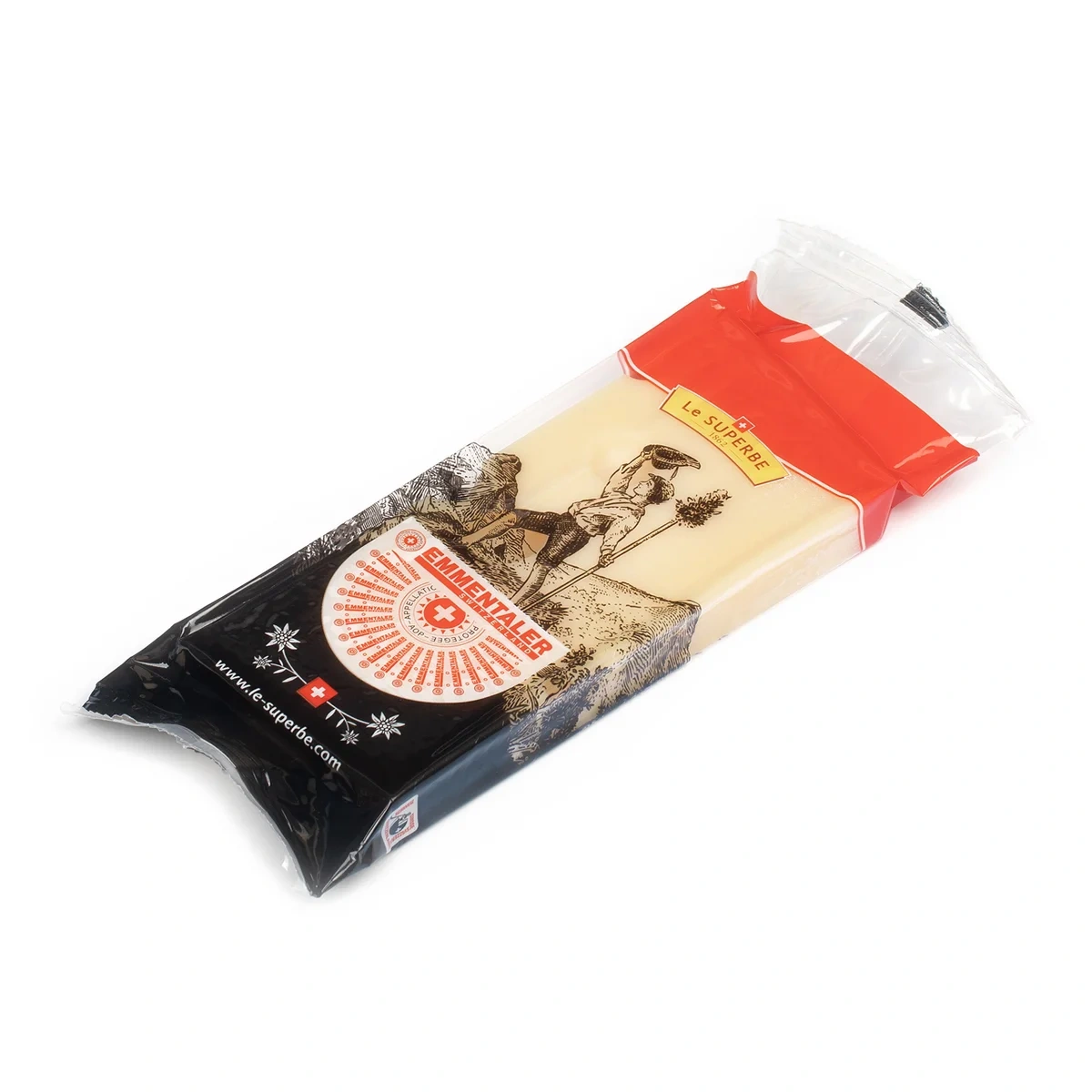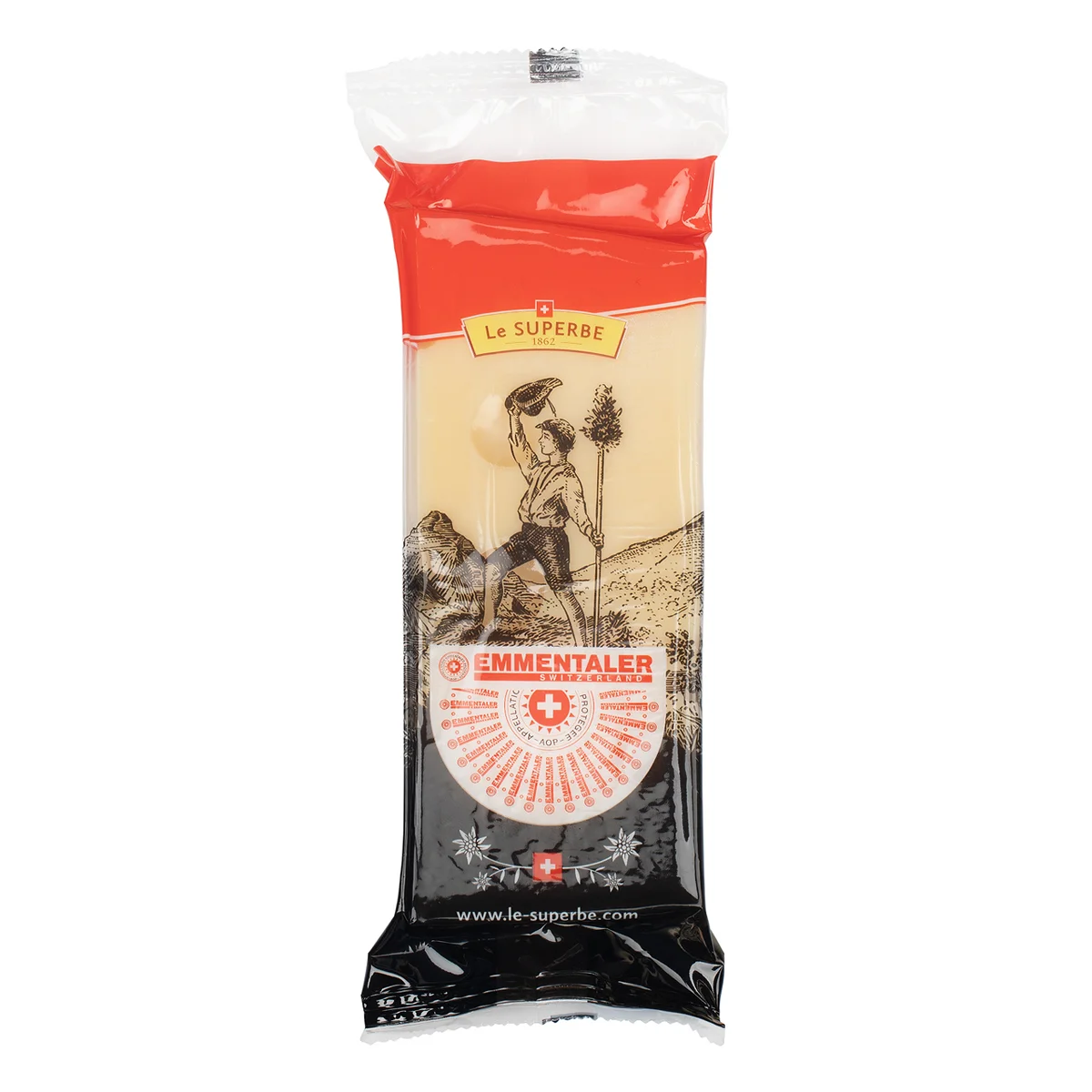 Сильный вкус, мягкая консистенция, цвет слоновой кости или светло-желтый и наличие крупных дырок делают этот сыр неповторимым. Швейцарский Эмменталь АОР ценится во всем мире. Период созревания составляет 5 месяцев. Идеален для приготовления салатов, бутербродов, горячих блюд. Эмменталь вместе с Грюйером добавляют в фондю. Производство этого сыра началось в XIII в., в кантоне Берн, в долине реки Эмме (по-немецки Эмменталь означает долина Эмме), где и продолжается до сих пор. Сыр Эмменталь вызревает в течение 2-12 месяцев, и хранится длительное время. Когда-то эмментальские крестьяне, передавали головки из поколения в поколение. Известны случаи, когда головки сыра хранились по 150 лет. Обладает слегка сладковатым вкусом с ореховыми, пряными и фруктовыми нотками. Вкус раскрывается постепенно, оставляя приятное послевкусие. Запах не сильный, но насыщенный. В сыре как будто отразилась Швейцария с её пологими холмами, зелёными лугами с пряными травами, свежим деревенским воздухом и эмментальскими деревянными домиками. Отборное молоко от коров, которые пасутся под открытым небом и питаются только свежей травой и сеном, обрабатывается в соответствии с высочайшими стандартами качества и традициями опытных мастеров-сыроделов. Не менее 120 дней созревания превращают эмменталер в совершенно особенное вкусовое наслаждение, гармонично сочетающееся с красным вином, фруктами и десертами.