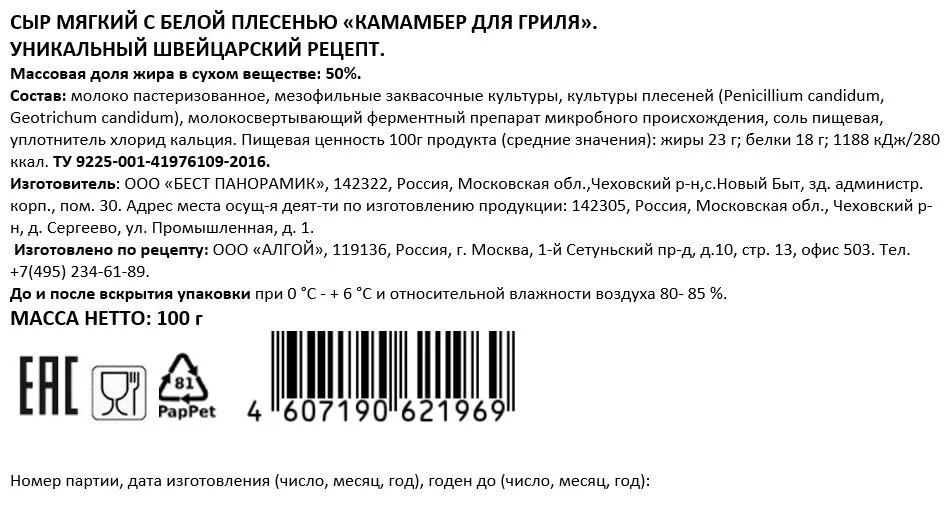 | Сорт | камамбер |