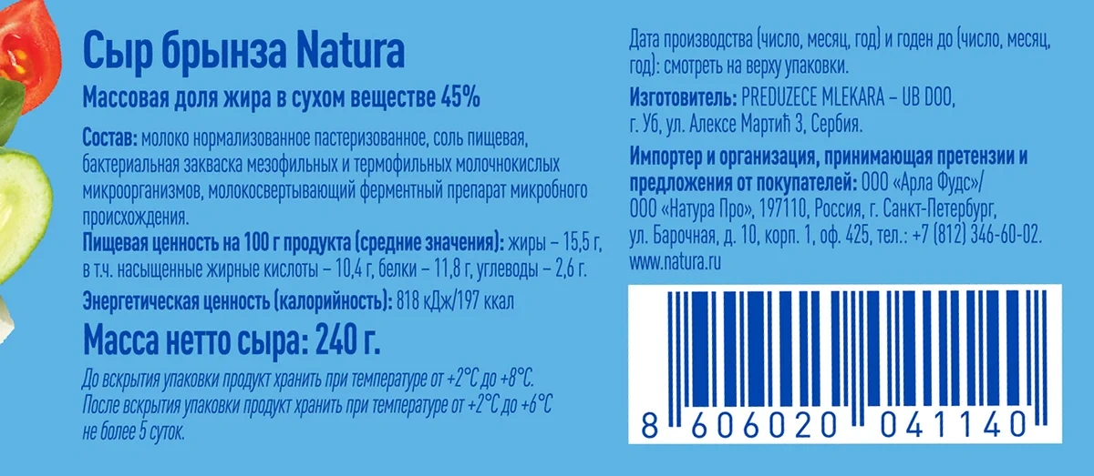 Изготовлен из натурального молока в экологически чистом регионе Сербии. Употребляется в основном для приготовления салатов, холодных закусок, но она также отлично подойдет и для горячих блюд. Нежный кисломолочный солоноватый вкус брынзы прекрасно раскрывается в сочетании со свежими хрустящими овощами, в составе различных салатов. В составе сыра не содержится красителей и консервантов.