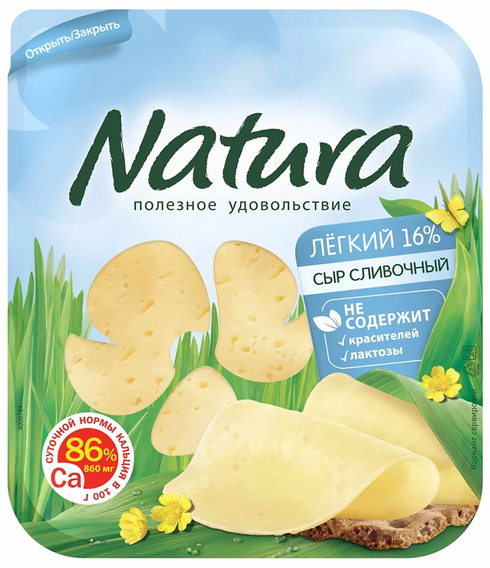 Сыр Natura Сливочный Лёгкий с пониженным содержанием молочного жира подходит для тех, кто заботится о своем здоровье: жирность 16% на 100 г. продукта. Сыр богат легкоусвояемым кальцием: 100 г продукта содержат 86% рекомендуемой суточной нормы потребления. Сыр Natura Сливочный Лёгкий не содержит красителей и консервантов и имеет нежный вкус натурального молока.