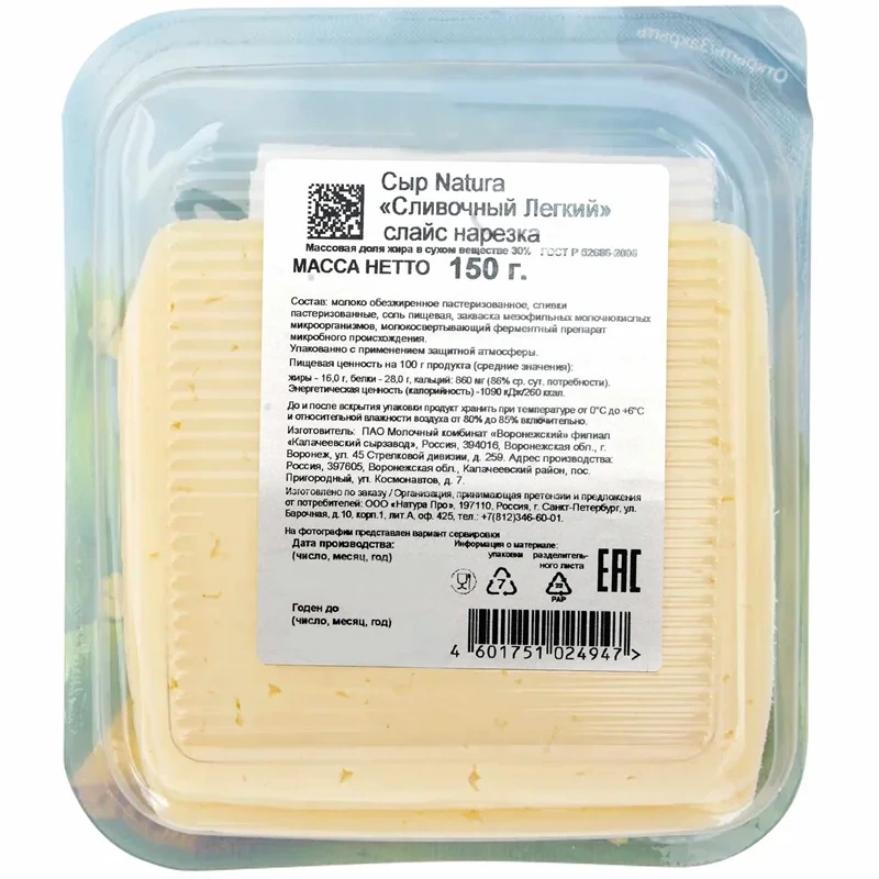 Сыр Natura Сливочный легкий полутвердый нарезка 16%, 150г