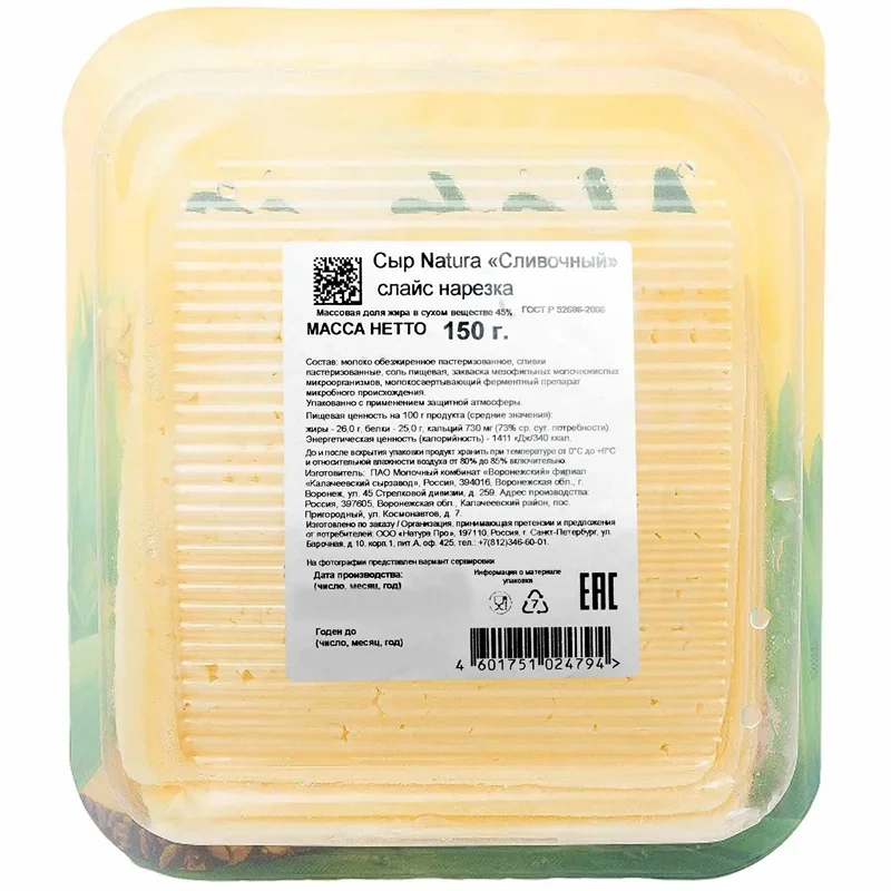 Сыр Natura Сливочный полутвердый нарезка 45%, 150г