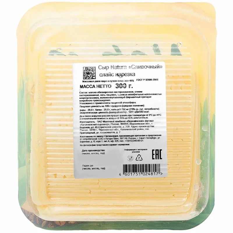 Сыр Natura Сливочный полутвердый нарезка 45%, 300г