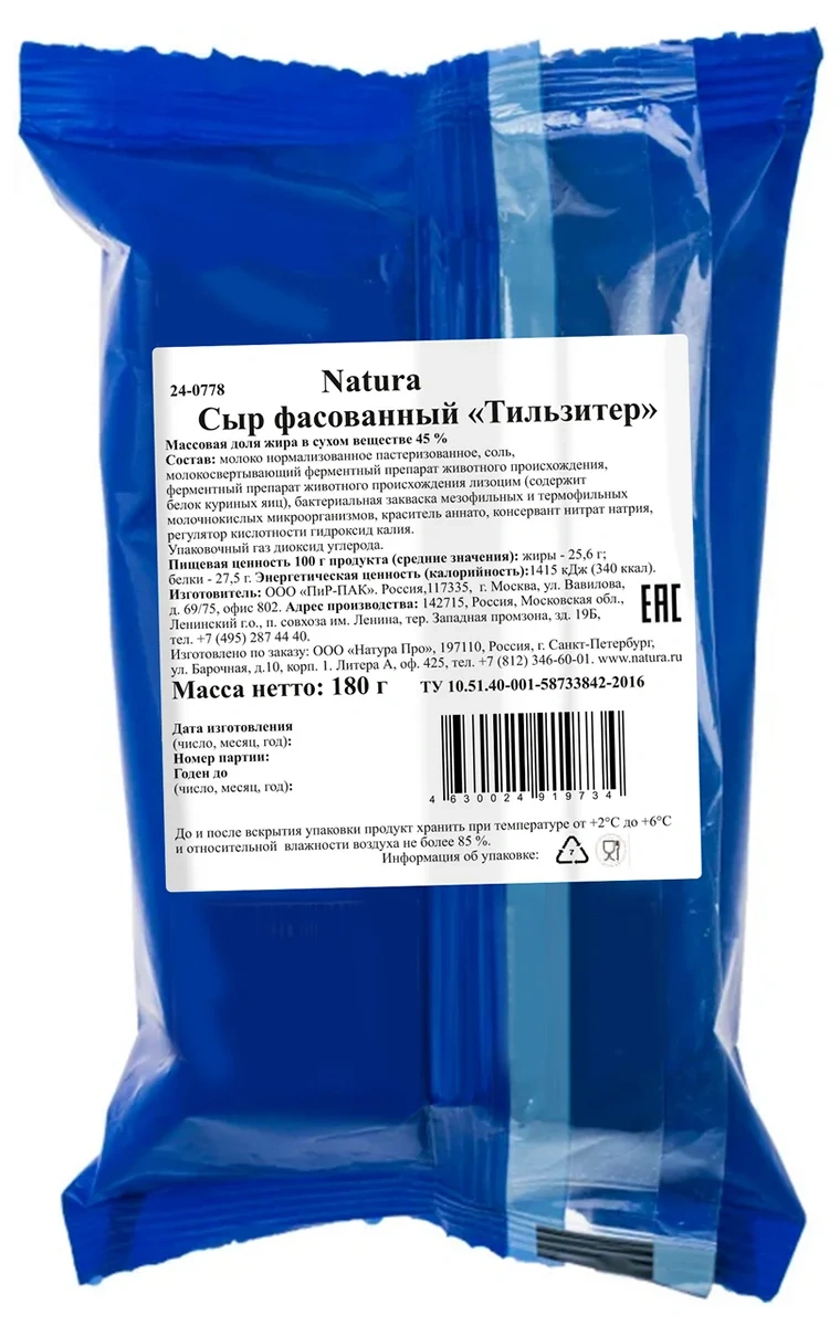 Сыр Natura Тильзитер кусок 45%, 180г