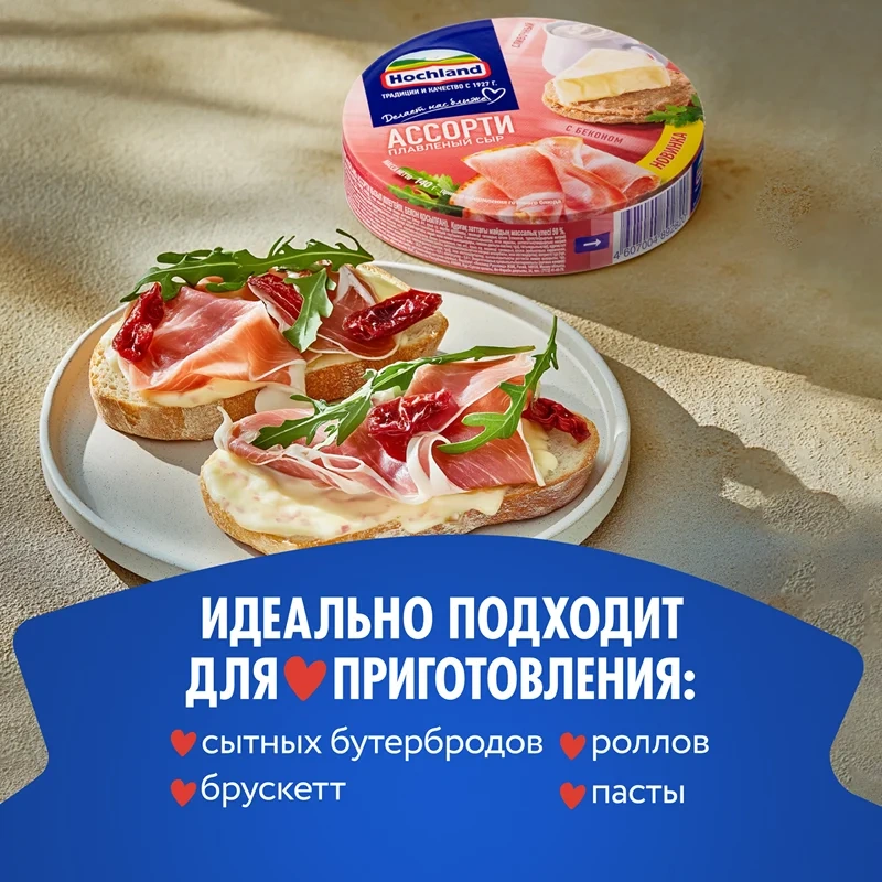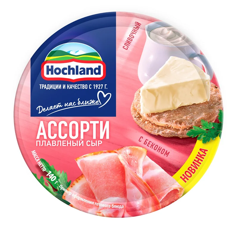 В одной упаковке плавленого сыра Hochland Ассорти Красное — два самых популярных вкуса. Дуэт нежного сливочного сыра и плавленого сыра с беконом не оставит никого равнодушным. Ведь теперь можно получить сразу двойное удовольствие, которое легко взять с собой!