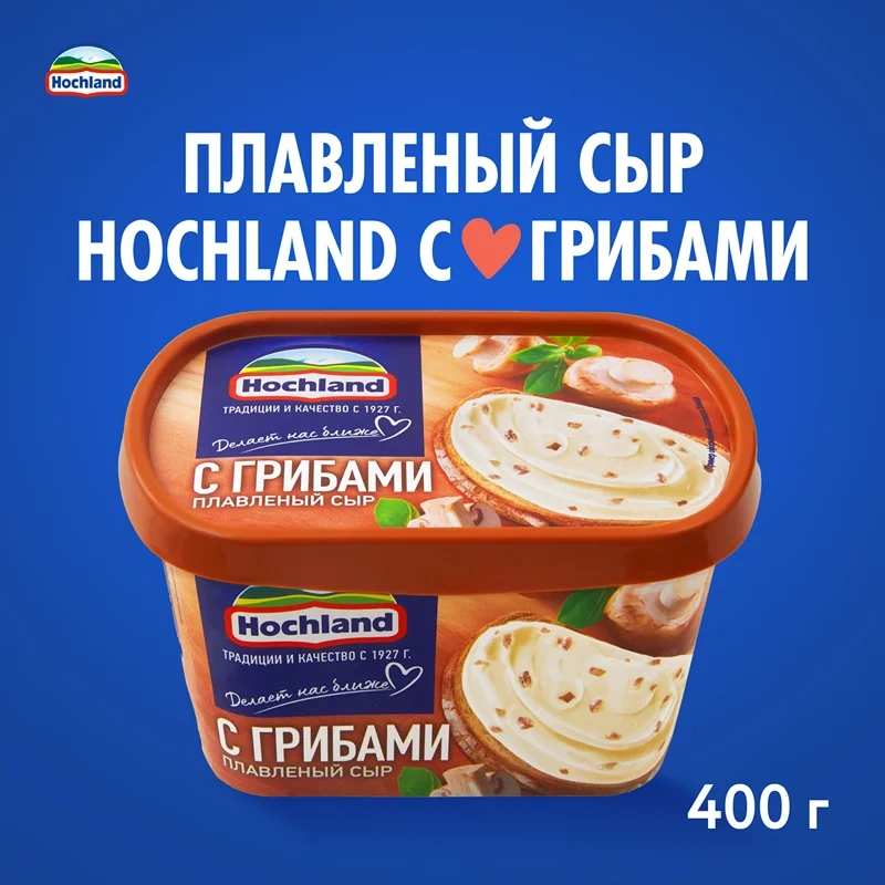 Сыр плавленый Hochland с грибами 55%, 400г БЗМЖ содержит много кусочков ароматного топпинга. Это классическое сочетание создано для тех, кто ценит яркий насыщенный вкус. Идеально подходит для приготовления бутербродов и сэндвичей на завтрак или в дорогу.