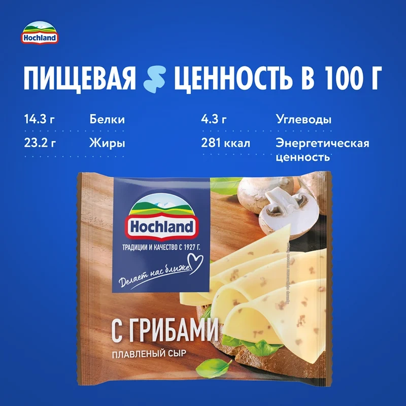 Сыр плавленый Hochland с грибами 45%, 150г БЗМЖ (без заменителя молочного жира) – это продукция известного немецкого производителя, созданная из полутвердых сыров высшего качества с добавлением грибов. При производстве этого ароматного сыра используется специально разработанная рецептура, благодаря которой он хорошо держит форму. Горячие бутерброды выглядят эстетично и аппетитно. Сыр отличается тонким грибным ароматом, мягким сливочным вкусом, приятной консистенцией. Продукт легко плавится и идеально подходит для приготовления бутербродов.