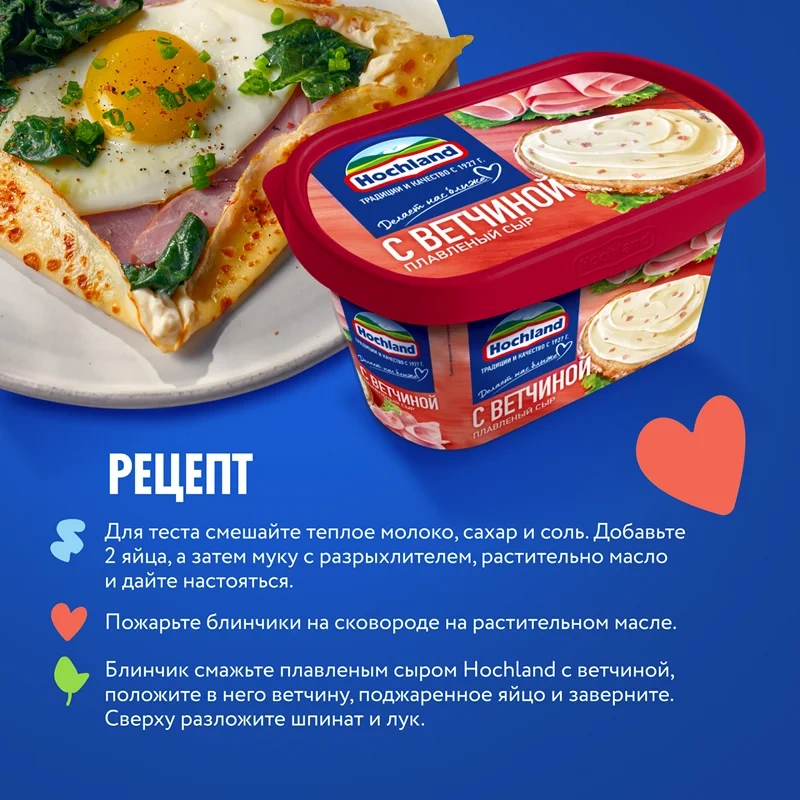 Сыр плавленый Hochland с ветчиной 55%, 400г — это сочетание нежного тающего плавленого сыра и классической ветчины. В нем не просто много, а очень много кусочков настоящей высококачественной ветчины, которая измельчается прямо перед добавлением в плавленый сыр. Благодаря выразительному вкусу и тонкому аромату, в котором смешались оттенки нежного сыра и сочной ветчины, продукт идеально дополняет блюда с овощами, супы, вторые блюда и гарниры. С ним также можно сделать насыщенный соус для картофеля или спагетти с душистой зеленью и сливками, превратив повседневную пасту в изысканное блюдо. Упаковки хватит для всей семьи. Побалуйте себя ярким насыщенным вкусом.