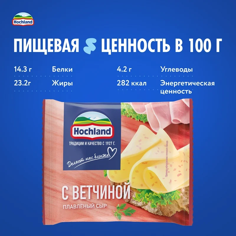 Плавленый сыр Hochland с ветчиной – один из самых популярных вкусов! Ломтики Hochland содержат большое количество сочных кусочков натуральной ветчины, а форма ломтика идеально подойдет для самого сложного бутерброда. Благодаря удобному формату упаковки любимым вкусом плавленого сыра можно насладиться в любой ситуации – будь то на работе, в дороге или на пикнике.