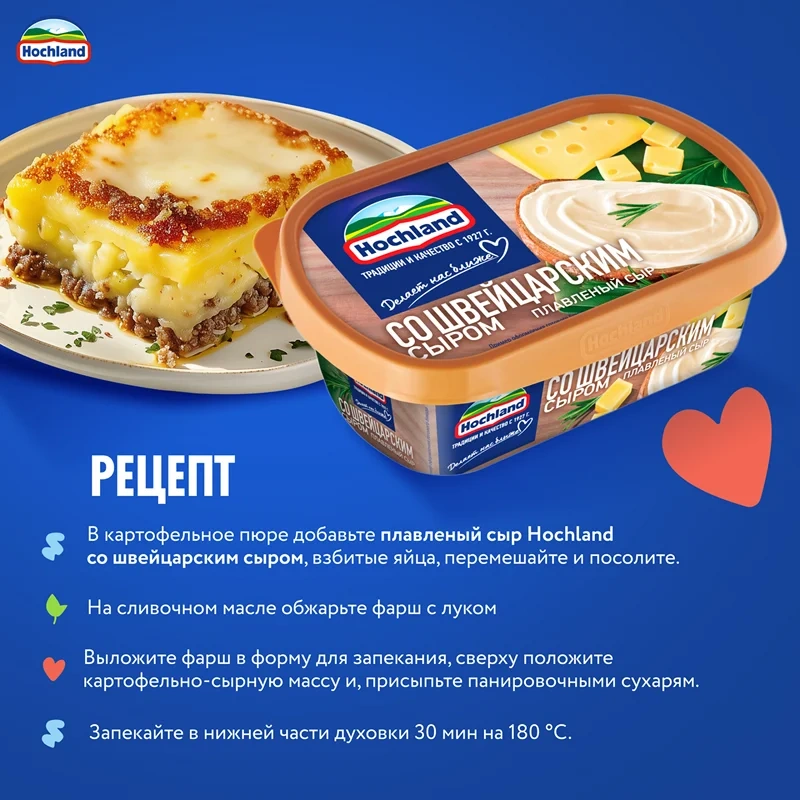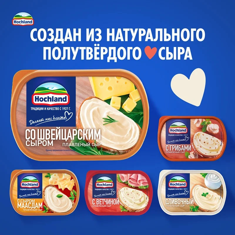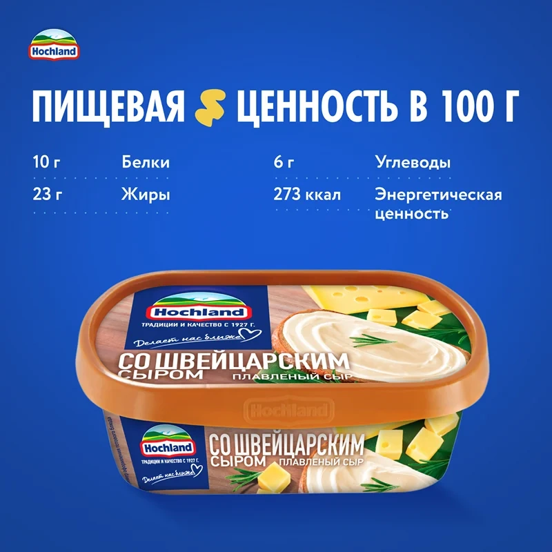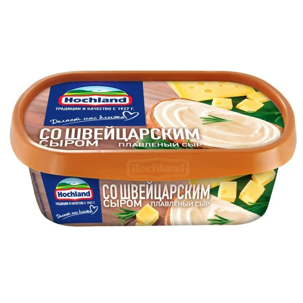 Любители классического вкуса могут насладиться богатым вкусом Швейцарского сыра в плавленом сыре Hochland, который изготавливается из классического твердого сыра с добавлением настоящего Швейцарского сыра Грюйер. Попробуйте уникальное сочетание богатого сырного вкуса и нежной обволакивающей консистенции в плавленом сыре Hochland со Швейцарским сыром.